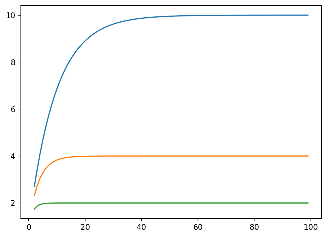 import matplotlib.pyplot as pltimport numpy as npdef geom_series(a, k): summation =sum(a**i for i inrange(0, k+1))return summationr1 =0.9r2 =0.75r3 =0.5x = np.arange(2, 100)y1 = np.array([geom_series(r1, k) for k in x])y2 = np.array([geom_series(r2, k) for k in x])y3 = np.array([geom_series(r3, k) for k in x])plt.clf()plt.plot(x, y1)plt.plot(x, y2)plt.plot(x, y3)plt.show()