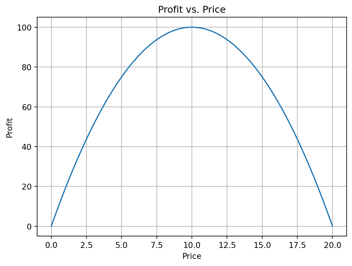 import numpy as npimport matplotlib.pyplot as pltdef profit(p):return-p**2+20*pprices = np.linspace(0, 20, 400)profits = profit(prices)plt.plot(prices, profits)plt.title('Profit vs. Price')plt.xlabel('Price')plt.ylabel('Profit')plt.grid(True)plt.show()
